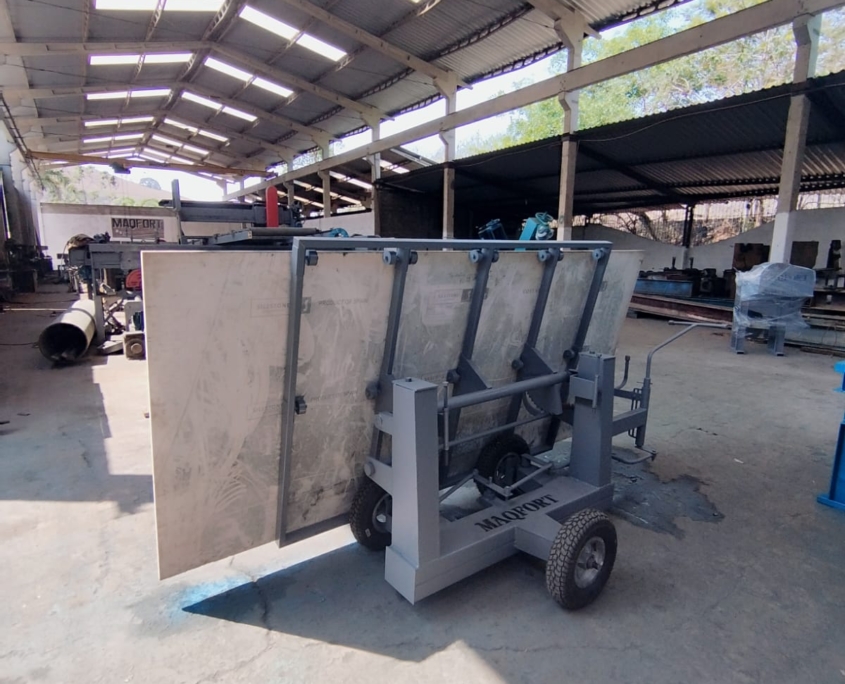 Uma viga em U com duas rodas, onde a chapa é encaixada e transportada manualmente.
